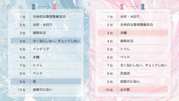 そして注目は、10位にランクインの「女の影」。絨毯に落ちている髪の毛やカレンダーに記載された予定などがチェックされているのは当たり前として、女子の目は部屋が不自然なほどきれいに整理・整頓されている、料理もしないのに食材や料理道具が揃っている、など、彼氏の部屋の隅から隅まで「女の影」を厳しくチェックし続けているのです。