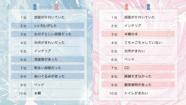 整理・整頓状況、掃除状況にチェックの目を光らせる男子達の好感度アップポイントは、やはり「部屋が片付いていた」ことのようですが、ただ片付いている、インテリアに凝っている、というだけでなく清潔感があって日当たりが良く明るい部屋、というのが高ポイントのようです。そして外せないのは「良い匂い」。さりげないルームフレグランスや女の子らしい香りなど、男子は自分の部屋には無い匂いに弱いようです。
