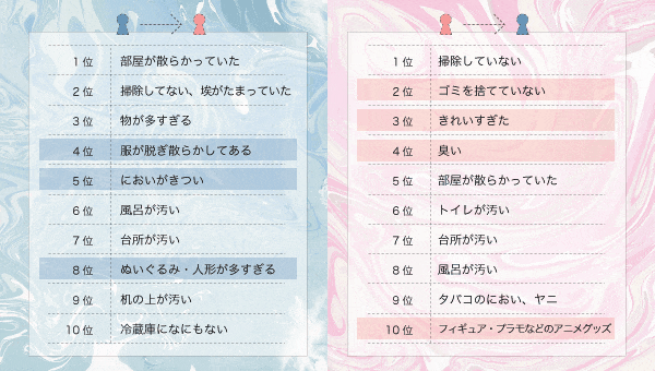 彼女の部屋に行って幻滅したことの第5位には、「匂いがきつい」という回答がランクインしています。見直したポイントの中には部屋のいいかおりという項目もあるのですが、やり過ぎにはくれぐれも注意!!というこということですね。香水の匂いや自分には合わないアロマ、きついお香など、自分とは合わない香りを無理に嗅がされても男子にはきつい匂いとしか認識できないようです。同様に、女の子ならではのぬいぐるみ、人形なども、余りに大量な場合、男子諸君には恐怖を与えてしまうようです。