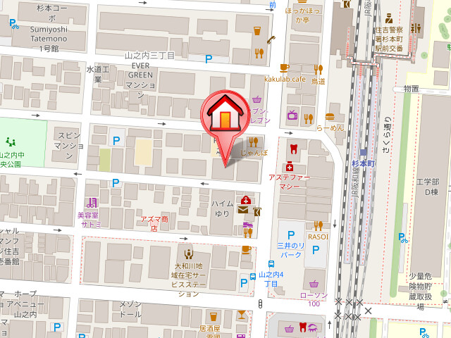 | 近隣情報 | コンビニ:ローソンストア100住吉山之内三丁目店93m スーパー:スーパーナショナル杉本店303m ショッピングセンター:西松屋住吉遠里小野店948m 飲食店:ガスト我孫子町駅前店(から好し取扱店)1143m 病院:医療法人守田会オリオノ病院1176m ドラッグストア:ツルハドラッグ住吉我孫子店1238m 役所:大阪市住吉区役所1325m |