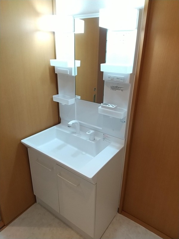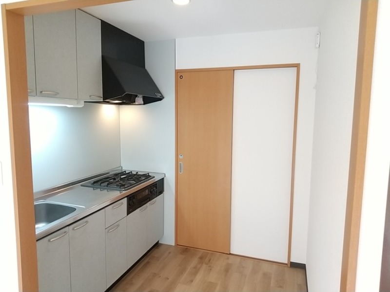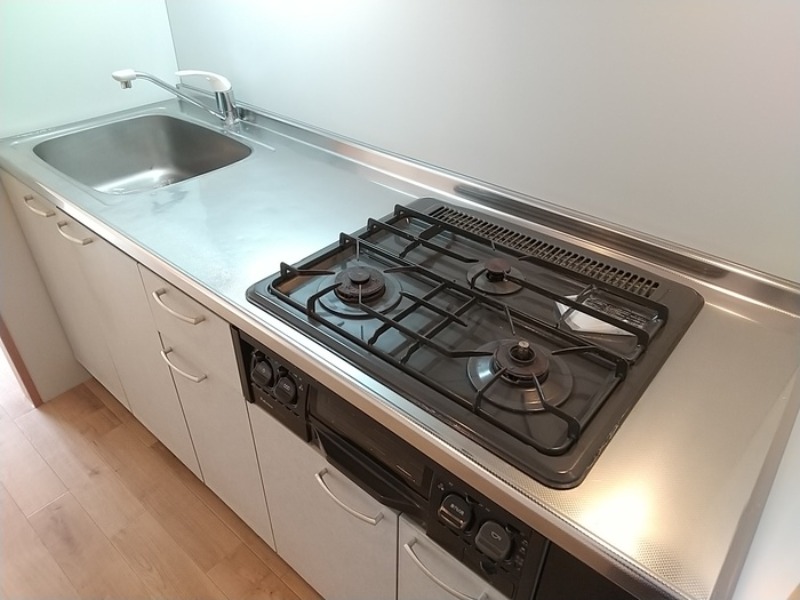二人入居可、システムキッチン、給湯、追焚機能、シャワー付洗面化粧台、CATV、宅配ボックス、駐輪場あり、浴室乾燥機、洗面所独立、防犯カメラ、シューズボックス、保証人不要、水道(公営)、ガス(都市)、排水(下水)、バス・トイレ別、シャワー、ガスコンロ、コンロ(三口)、エアコン、室内洗濯機置き場、バルコニー、フローリング、TVドアホン、礼金無し、敷金なし